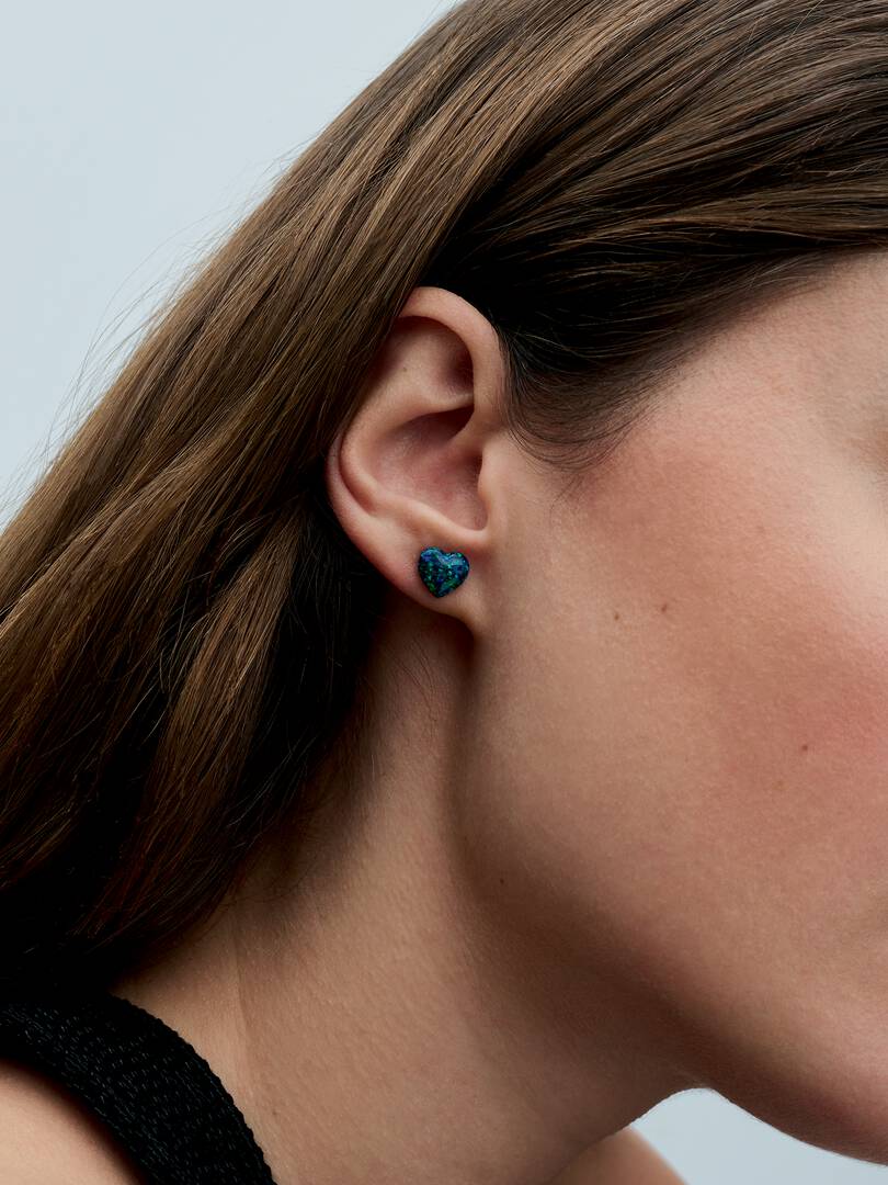 Channel the heart of the jungle with the Opalescent Green Heart Stud Earrings. A lab-created, heart-shaped iridescent opal features a spectrum of green-and-blue hues and streaks of glitter designed to evoke the vivid col