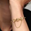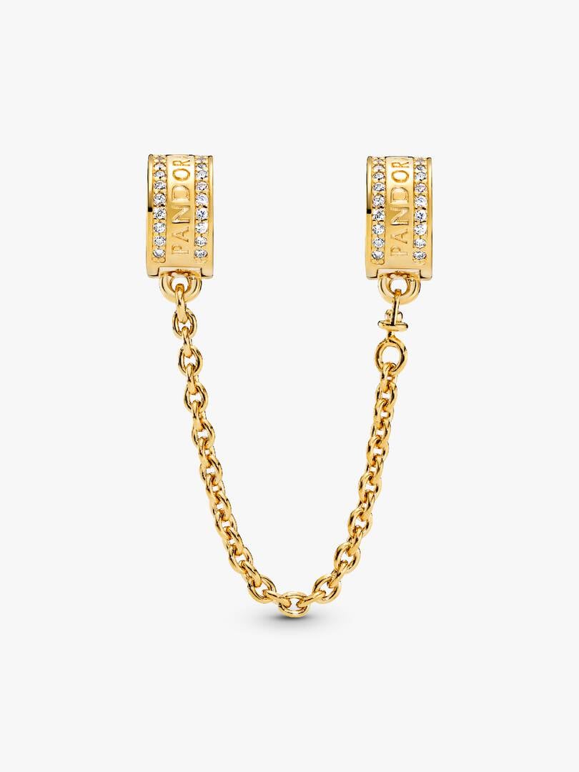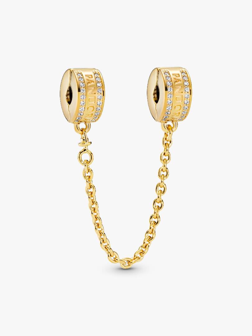 Keep charms in check with our brand Logo Safety Chain Charm, made for brand Moments bracelets. Plated with 14k gold, the clips are detailed with our logo as well as lines of cubic zirconia stones. The safety chain ch