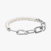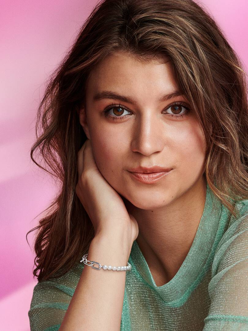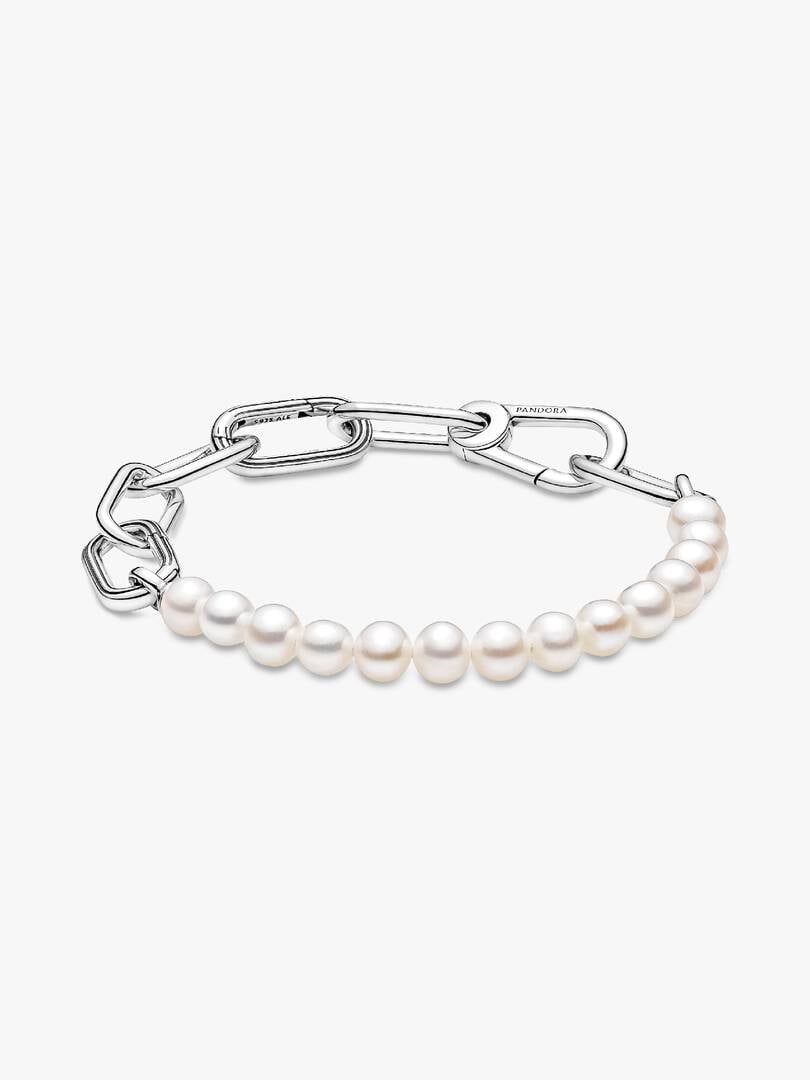 links – designed with grooved surfaces to set them apart – that link to a row of ethereal treated freshwater cultured pearls and a carabiner clasp closure. Customize your link chain first: one set of interlocking styling links can be swapped out for one styling double link or one styling link – keep the original length or adjust it to suit you. Once you’ve curated your link chain, style up to two medallion charms on your openable links, or up to eight mini dangle charms to show the world who you are. NOTE: the relevant treatments for treated freshwater cultured pearls are bleaching or dyeing and luster enhancement. Discover how to mix and re-mix your brand ME look here.