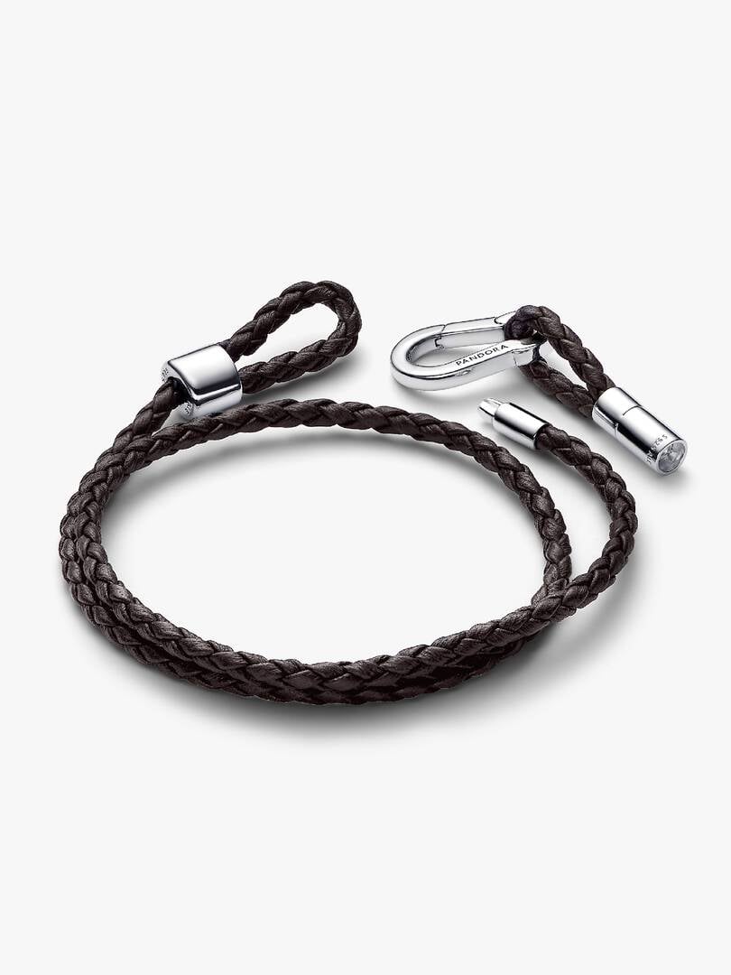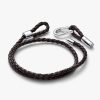 Earthy meets edgy in the brand Moments Brown Braided Double Leather Bracelet. Braided brown leather wraps around twice and closes with a sterling silver carabiner clasp that has a brand logo engraved on both sides. A