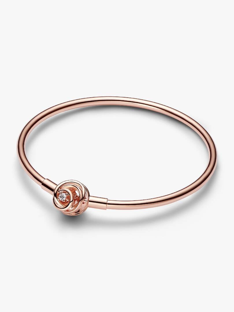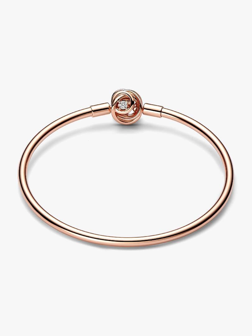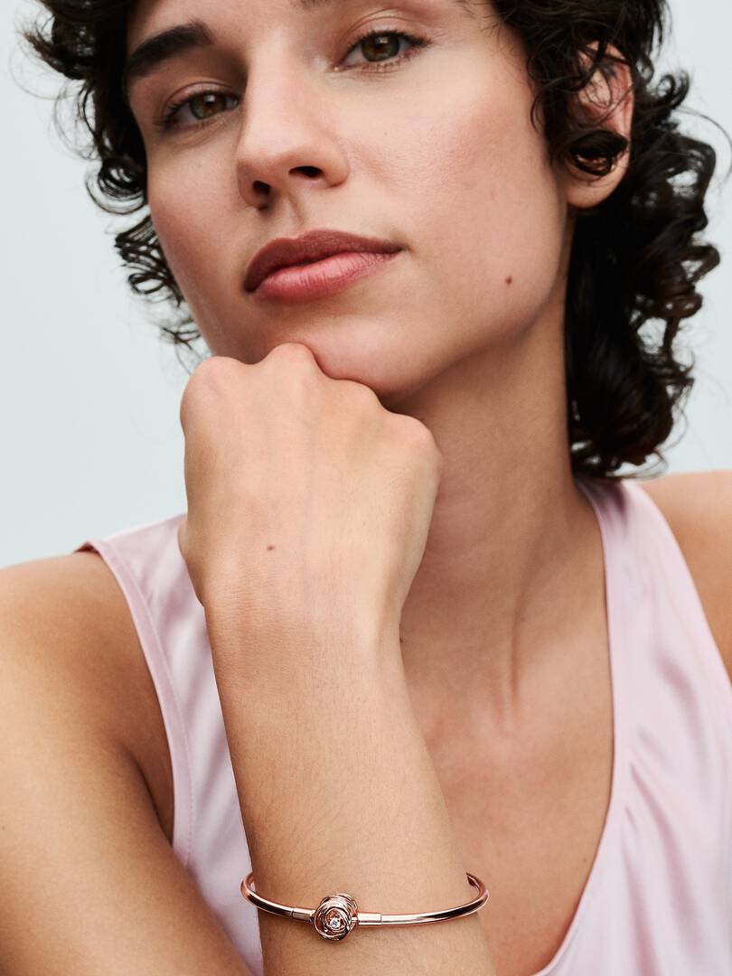 Celebrate the power of love with our brand Moments Encircled Clasp Bangle, a shimmering statement piece plated with 14k rose gold. Featuring an encircled clasp, the bangle is a symbol of infinite connections. The openw