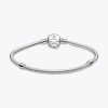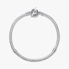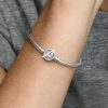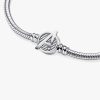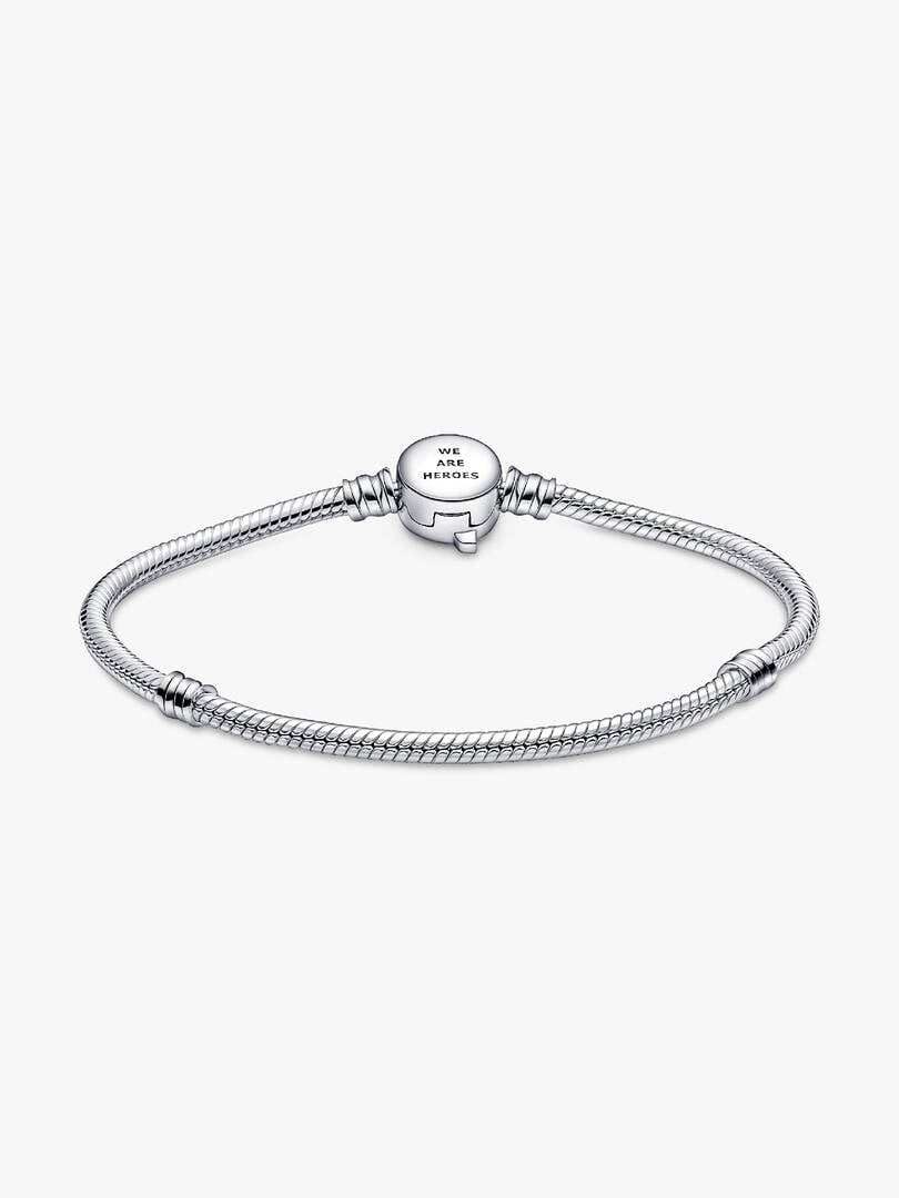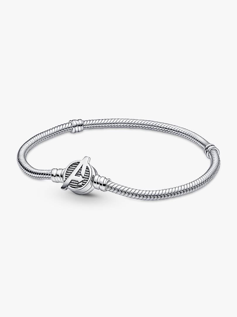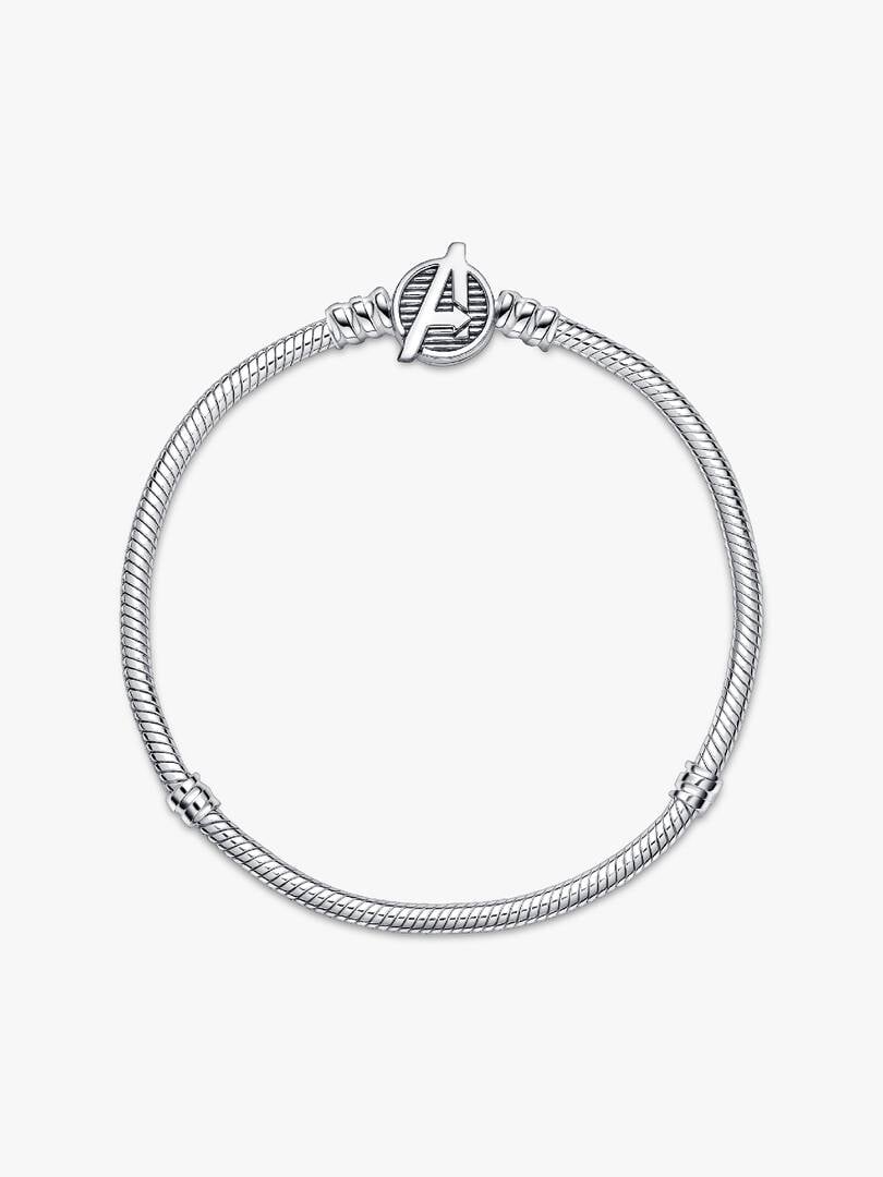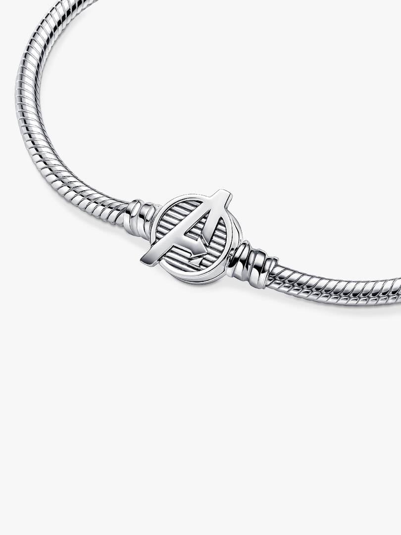 Assemble your heroes on our brand Moments Marvel The Avengers Logo Clasp Snake Chain Bracelet. Hand-finished in sterling silver, this charm holder features a clasp engraved with the iconic Avengers logo and etched line