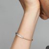 profile transitions from square to round; the squared half features evenly spaced sparkling baguette stones, while the rounded part is warm-toned. The engraved logo on the side corresponds with the placement of the baguette stones. The unique hinge and click closure clasp make it easy to wear and remove this brand bangle bracelet. Wear alone as your signature piece, or stack multiple bracelets for a bold look.