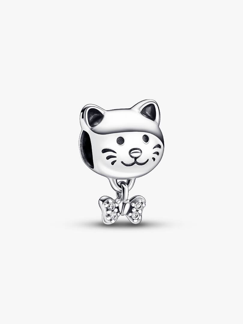 Let your love for your feline bestie shine with the Pet Cat & Bow Charm. Crafted from sterling silver, this retro piece with a modern touch is decorated with engraved lines on the face and sparkling pavé on the bow dangl