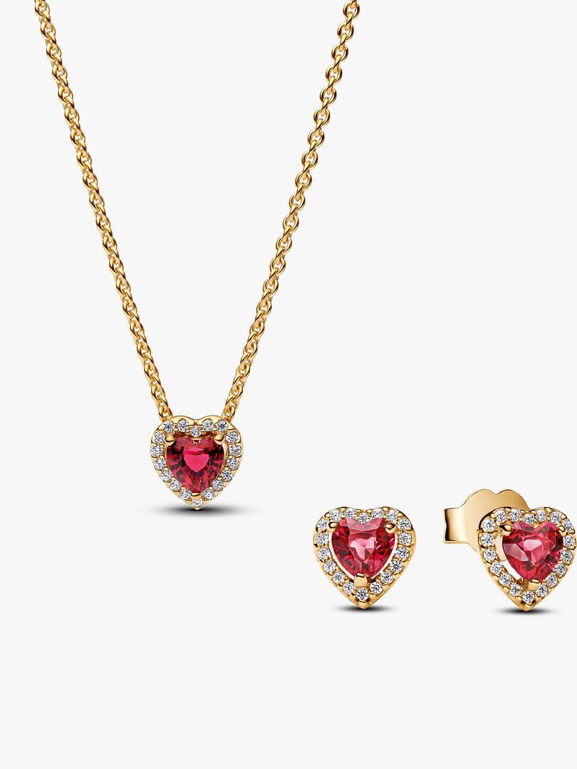 Add a pop of red and a whole lot of heart. This sterling silver set features stud earrings and a pendant necklace, each featuring raised hearts framed by sparkling pavé — a perfect duo to celebrate love and light.