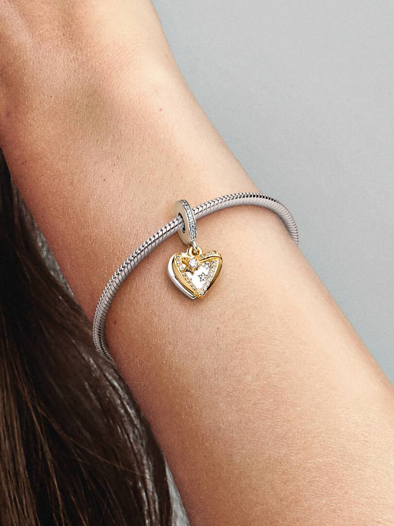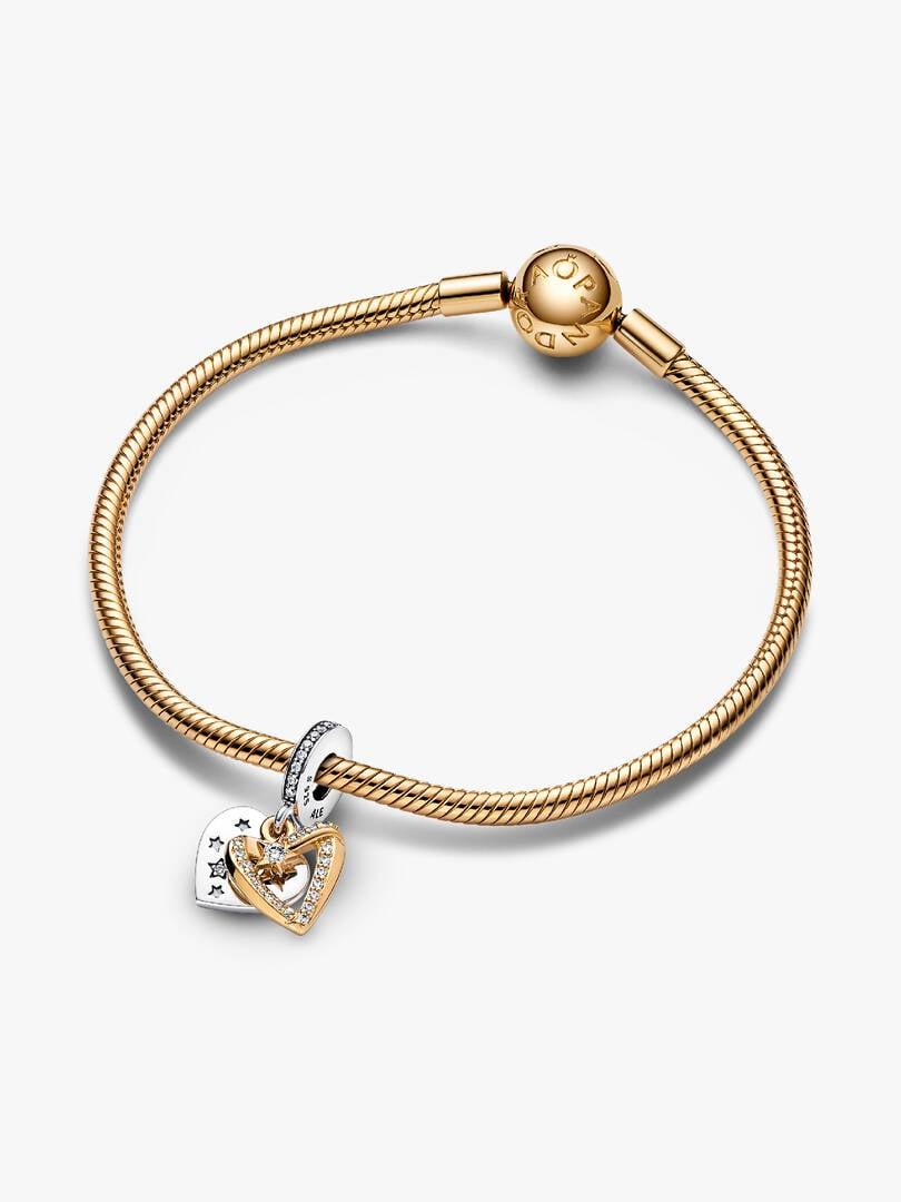 Add a celestial dimension to Chinese Valentine’s Day with our Shooting Star Hearts Double Dangle Charm. This two-tone symbol of heavenly romance features a 14k gold-plated heart, decorated with a constellation of sparkli
