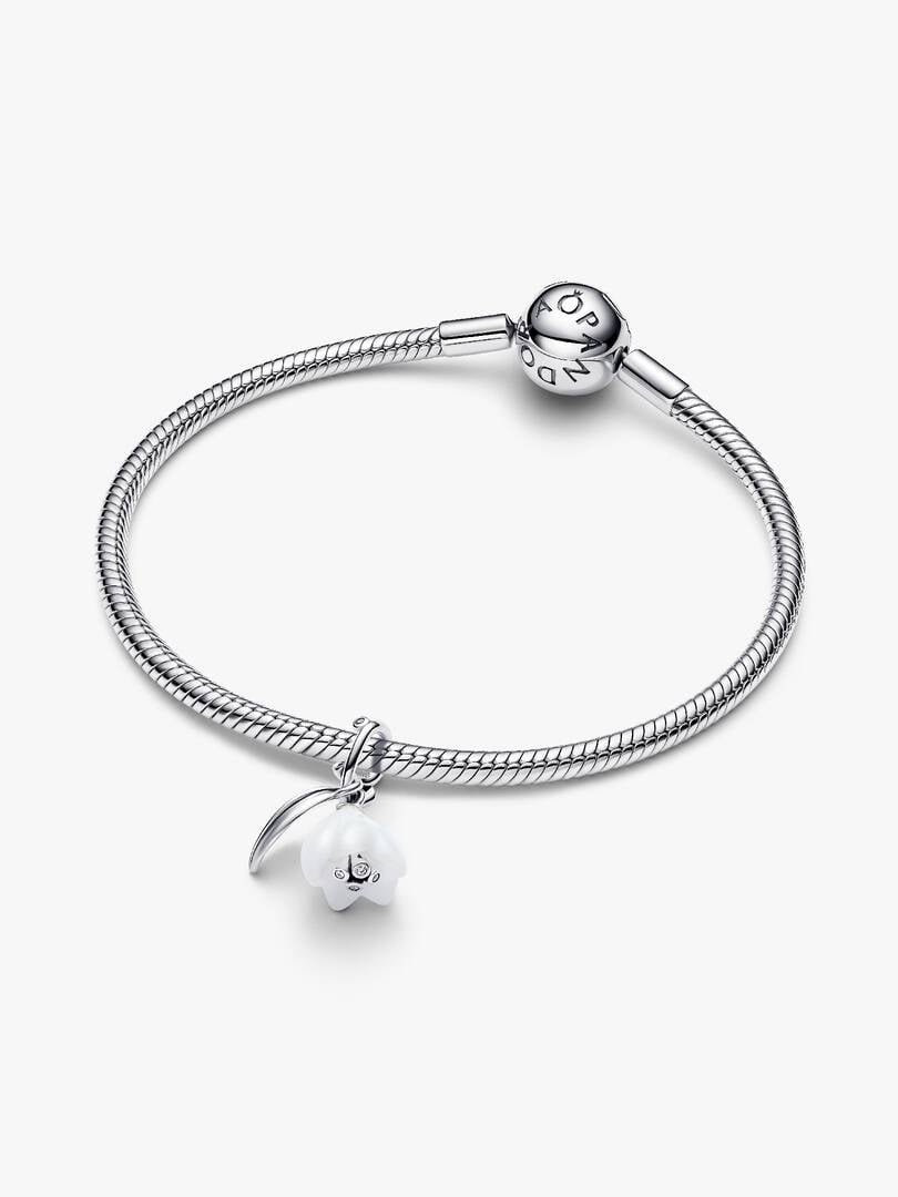 Bloom with courage – and carry the reminder with you. This sterling silver charm features a snowdrop flower in white Murano glass, sparkling cubic zirconia and a dangling leaf engraved with the same message.