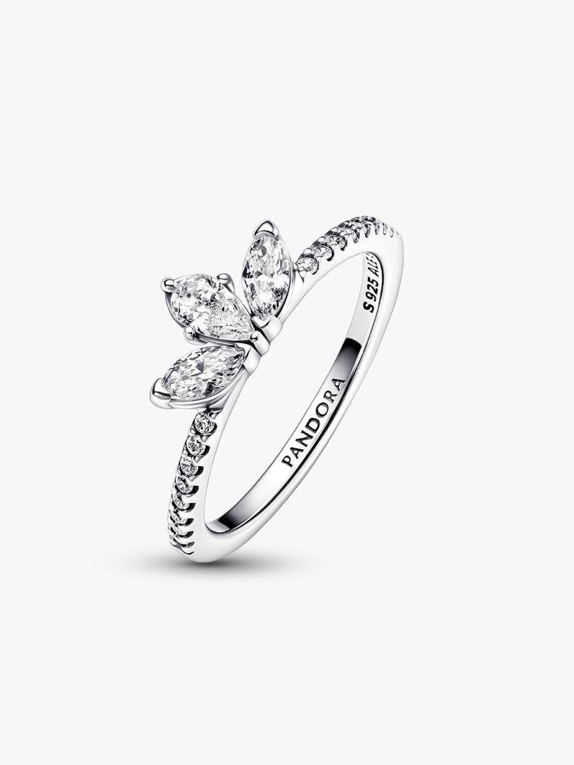 Our Sparkling Herbarium Cluster Ring features three central stones in a petal shape, two marquise-shaped and one pear-shaped. Crafted from sterling silver, this elegant ring is inspired by the beauty of nature, with peta