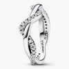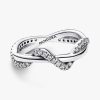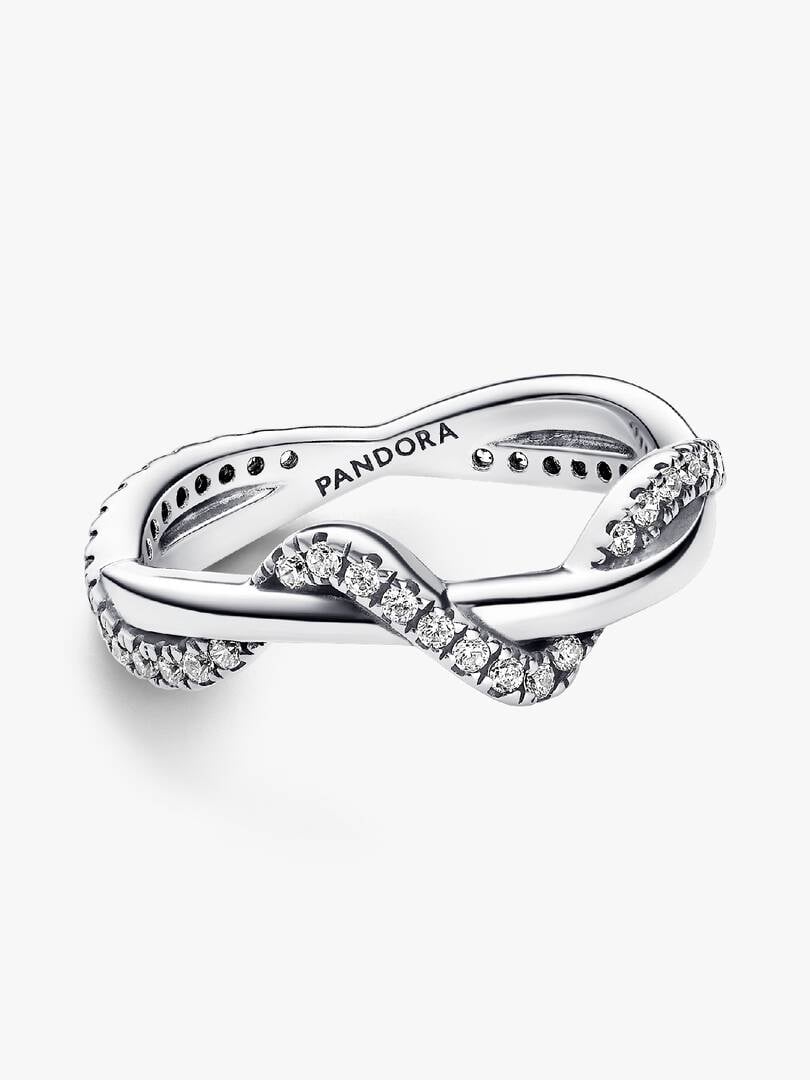 A new wave of stacking. Crafted from sterling silver, our Sparkling Intertwined Wave Ring is inspired by the movement of ocean waves. It features a smooth polished ring band with a wavier band entwined around it, set wit