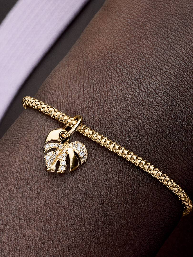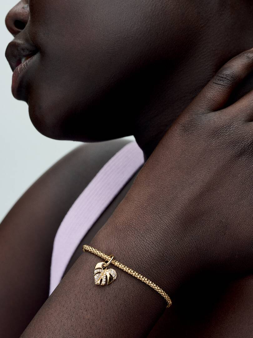 Wear an ode to nature with the Sparkling Monstera Leaf Dangle Charm. This 14k gold-plated leaf charm features one side covered in sparkling pavé, while the other side has realistic embellishments such as the ribs and vei