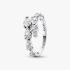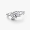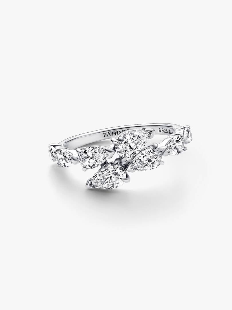 Wrap yourself in sparkling style with the Sparkling Overlapping Band Ring. This sterling silver ring features four pear-shaped stones on each overlapping end. V-shaped prongs at the tip of each stone emphasise the pear s