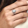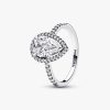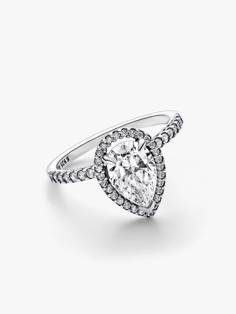 Shine brighter than ever when you wear the Sparkling Pear Halo Ring. This sterling silver ring features one striking pear-shaped stone set slightly above a delicate pavé halo. A V-shaped prong and two claw prongs hold th