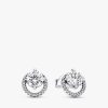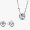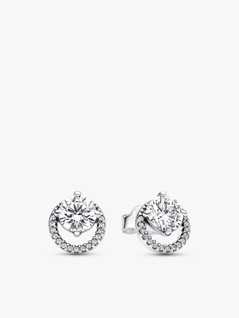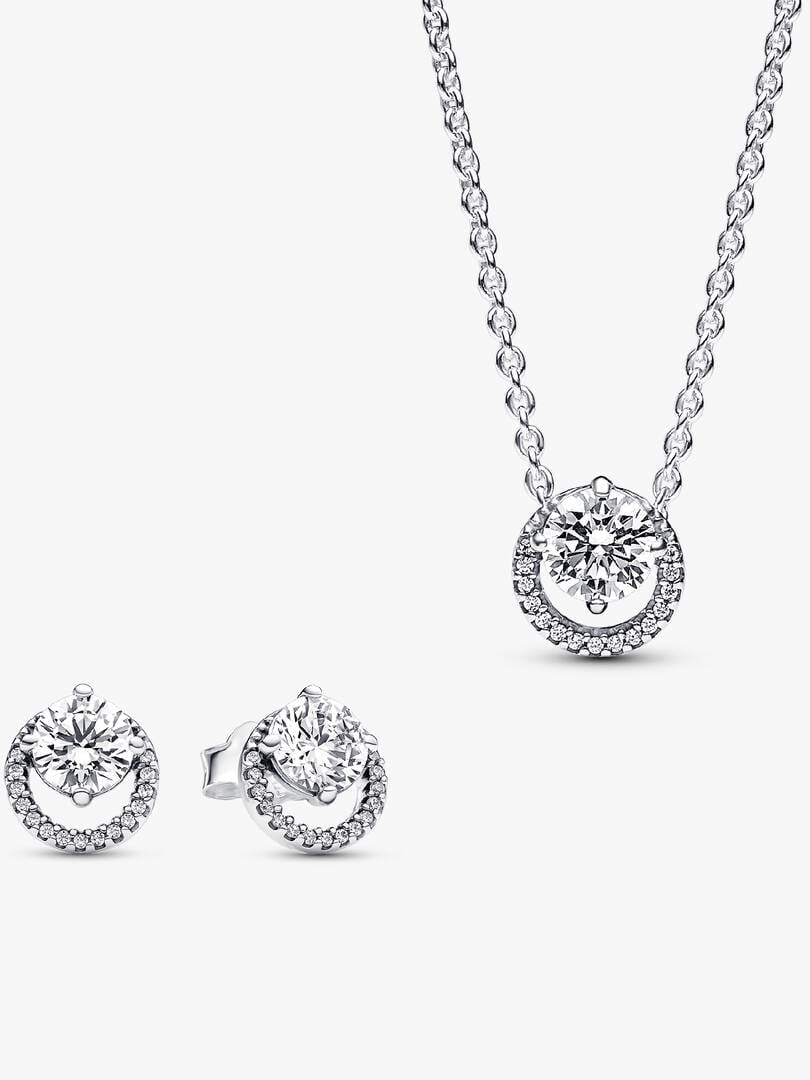 ng cubic zirconia, these earrings capture the everlasting symbolism of circles. The sterling silver Sparkling Round Halo Pendant Collier Necklace, adorned with clear cubic zirconia, represents the enduring beauty of circles. The pendant features an off-centre, prong-set round stone that delicately overlaps a pavé halo, allowing it to slide freely along the adjustable 38 cm, 42 cm, or 45 cm cable chain. With an engraved brand logo and a dangling stone by the lobster clasp, this necklace adds sophistication to any look. The design, inspired by brand Timeless motifs, seamlessly blends classic beauty with giftable elegance.