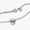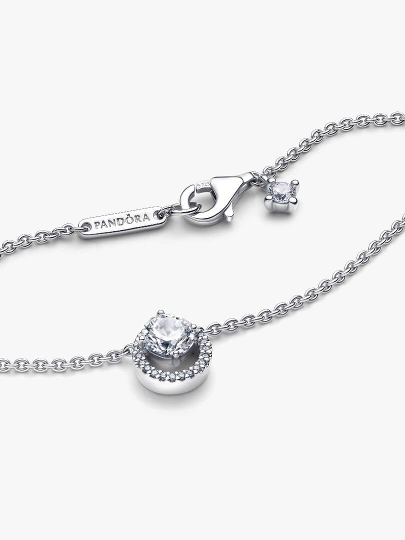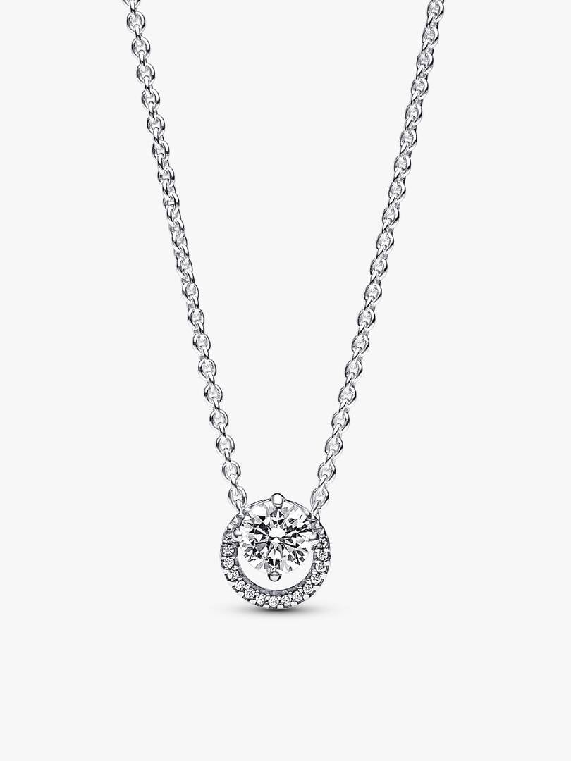 Channelling timeless elegance, the sterling silver Sparkling Round Halo Pendant Collier Necklace, adorned with clear cubic zirconia, represents the enduring beauty of circles. The pendant features an off-center, prong-se