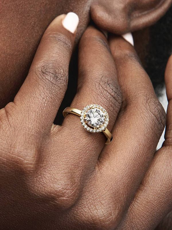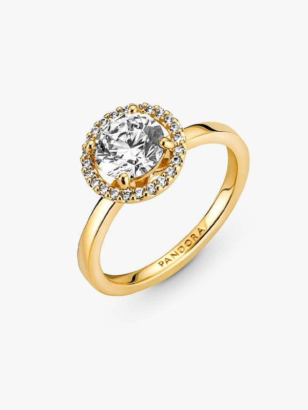 Classic yet modern, the 14k gold-plated Sparkling Round Halo Ring features a round center stone encircled by a halo of brilliant-cut clear cubic zirconia pavé. The brand logo is engraved on the inside of the shank. A t