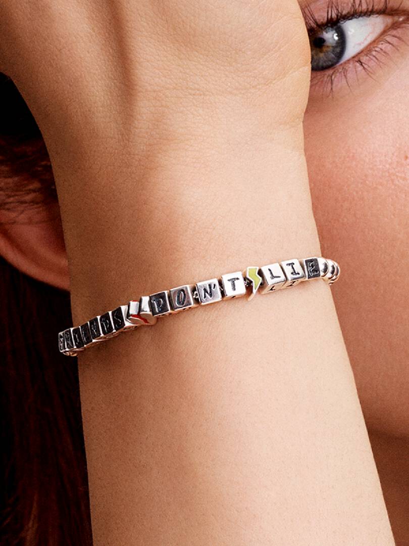 IE”. These words are separated by glitching heart and lightning bolt symbols, finished with glow-in-the-dark enamel. The rest of the bracelet is made up of round metal beads that lead to a tube-shaped clasp engraved with the Netflix logo and the initials “ST”. Wear it in tribute to your gang, or gift it to your closest friends.