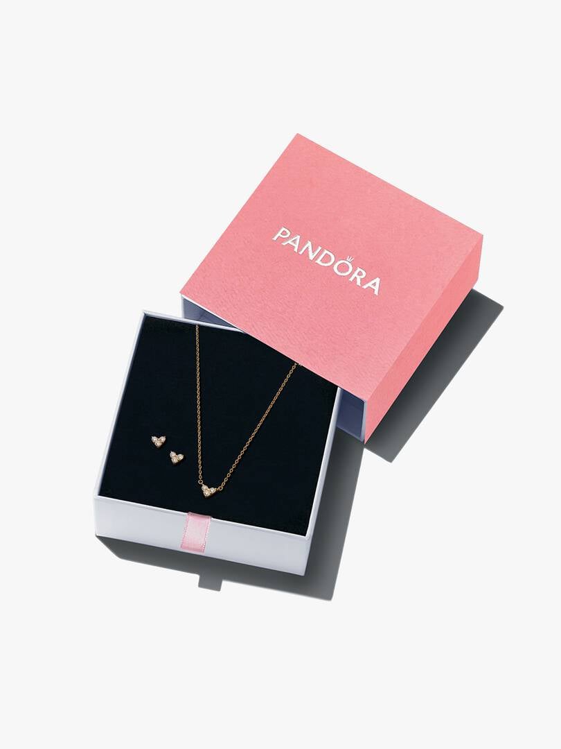 Gifts for the greatest love of all. Inspired by its irresistible nature, the necklace and earrings set each feature three sparkling stones accented by rounded beads in an elegant heart-shape style. Lovingly crafted in 14