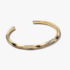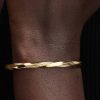 Celebrate individuality with a twisted open bangle, featuring a unique profile with alternating polished surface and grooved lines, perfect for stacking and expressing your personality.