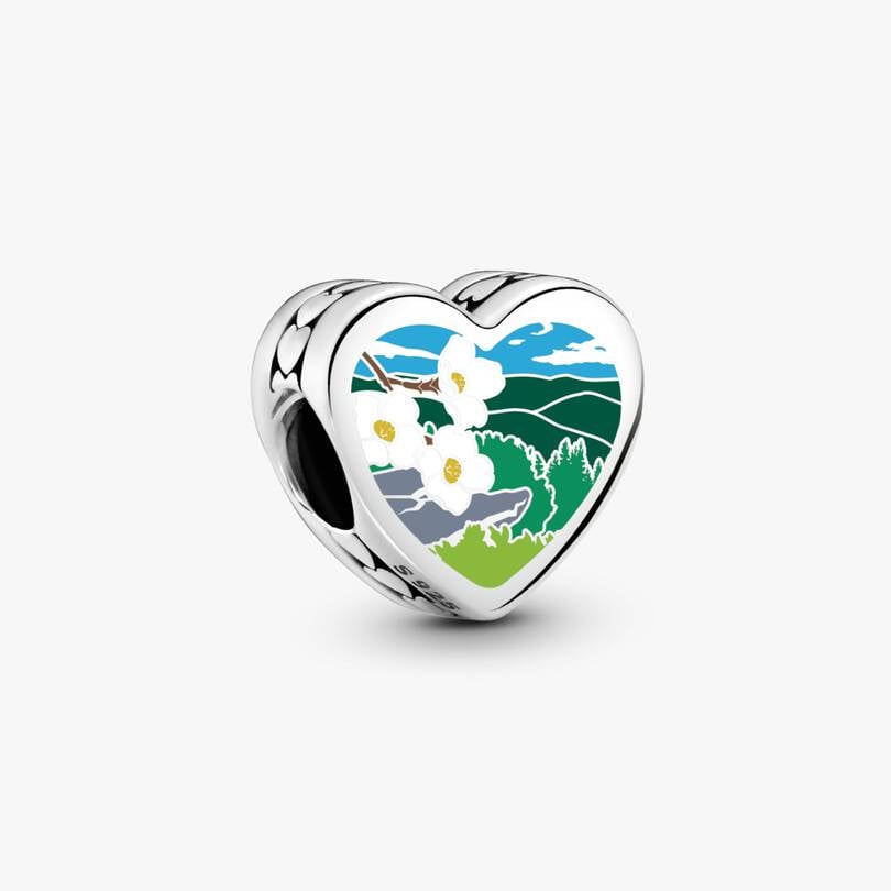 Virginia’s breathtaking countryside comes to life on this heart-shaped charm in sterling silver. One side captures the beauty of rolling hills, clear blue skies, and blooming dogwood flowers in glossy enamel. On the othe