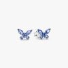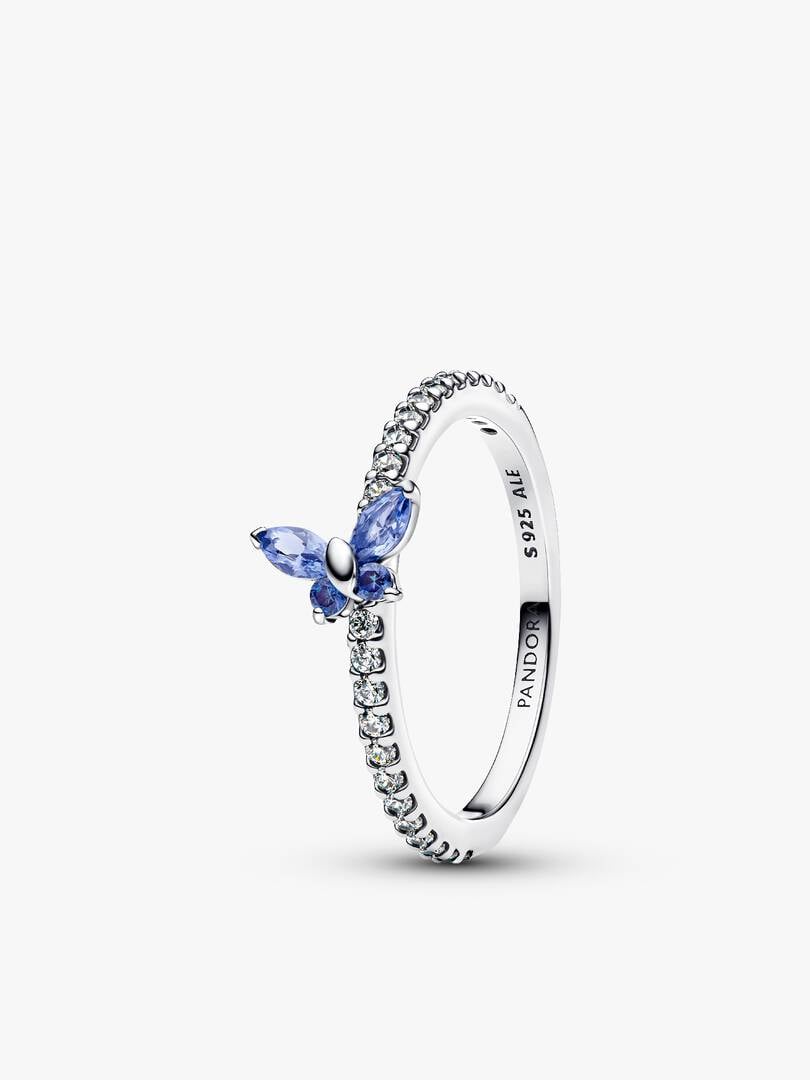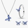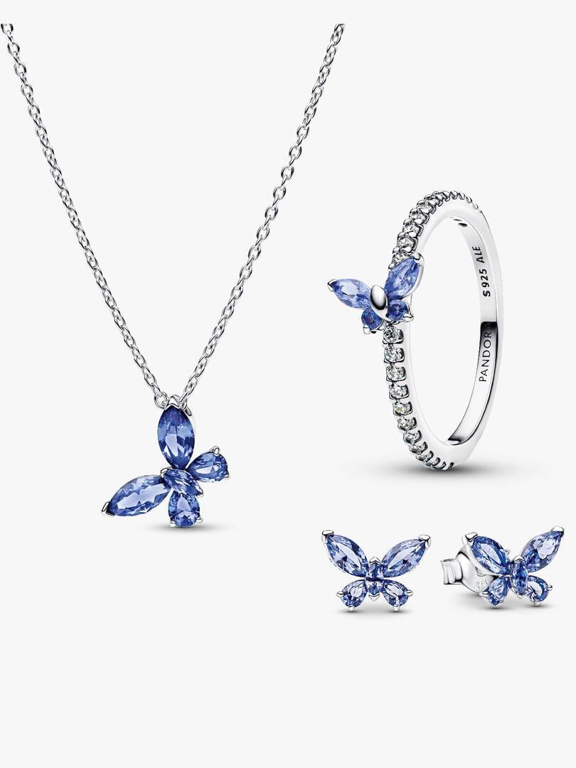 Transform your look with our trio of butterfly-inspired jewelry. This set includes a matching ring, necklace and stud earrings, crafted in sterling silver with man-made winter blue crystals.