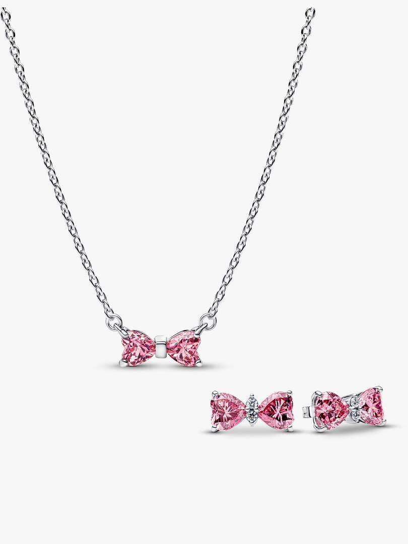Wrap yourself up in our Bow Necklace and Earring Set. Includes our bow stud earrings set with heart-shaped pink and clear cubic zirconia and a matching sterling silver bow necklace that adjusts for length.